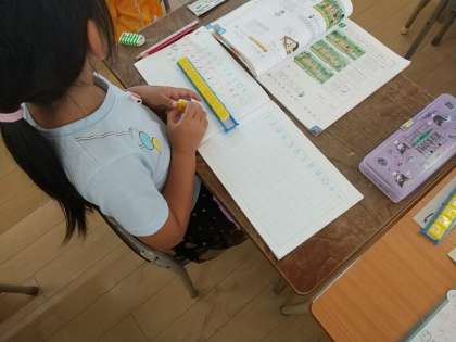 先週から指導している算数で、「3つのかずのけいさん」を学習しました。