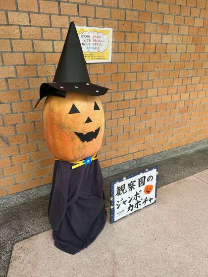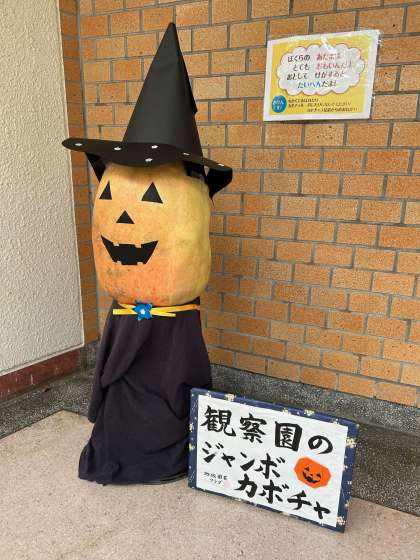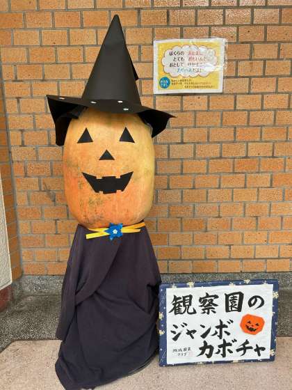 自然観察園で取れたジャンボかぼちゃを使って、地域園芸クラブのみなさんがハロウィンのかぼちゃオバケを作ってくださいました。