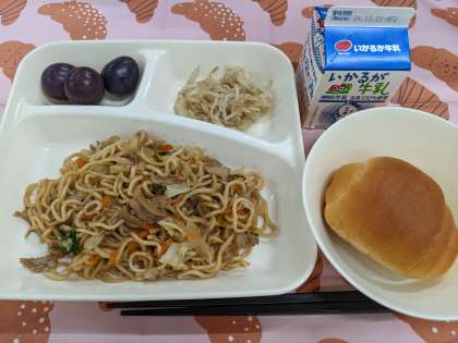 9月25日(水)の給食は「オイスターソース焼きそば、もやしのしょうがづけ、ぶどう(巨峰)、ミニコッペパン、牛乳」です。