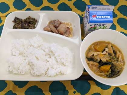 9月30日(月)の給食は「鶏肉のてり焼き、かぼちゃのみそ汁、なすのそぼろいため、ごはん、牛乳」です。