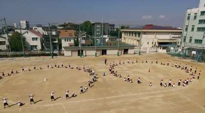 1年生4クラス全員が運動場に出て体育をしています。