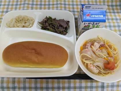 10月2日(水)の給食は「牛肉の香味焼き、トマトのスープスパゲッティ、キャベツのサワーソテー、パンプキンパン、牛乳」です。
