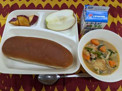 10月4日(金)の給食は「中華煮、大学いも、りんご、黒糖パン、牛乳」です。