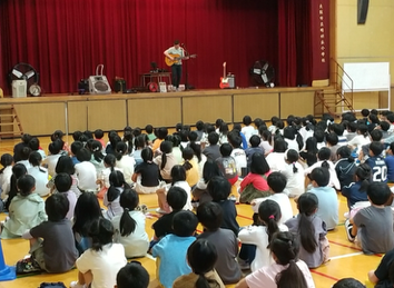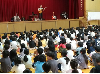 今日は、晴明丘小学校に海外からのアーティストが来てくれました。オーストラリアから来日されたサイモンさんと、ヨーロッパ圏から来日されたOranji Sonさんの2組ミニコンサートでした。通訳の方からのお話も聞きながら、子どもたちは演奏を楽しんでました。