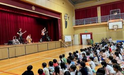 2組目の演奏が続きます。手拍子や手を振ることもリズム遊びの一つです。曲に合わせて体を動かすことに慣れてきたようでした。教室に戻ってきた子どもたちは、「叩くと音が出る椅子(カホーン)があったで!」と嬉しそうに感想を話していました。