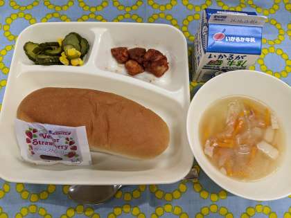 10月9日(水)の給食は「まぐろのオーロラ煮、スープ、きゅうりとコーンのサラダ、コッペパン、いちごジャム、牛乳」です。