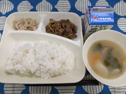 10月10日(木)の給食は「プルコギ、トック、もやしのナムル、ごはん、牛乳」です。今日は韓国・朝鮮料理のこんだてです。