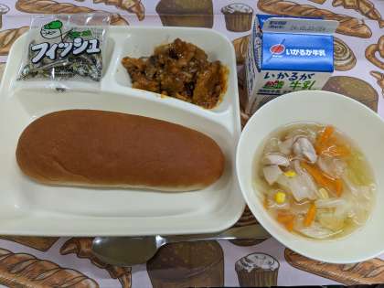 10月17日(木)の給食は「なすのミートグラタン、鶏肉とキャベツのスープ、ミニフィッシュ、黒糖パン、牛乳」です。