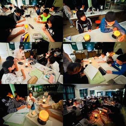 暗くした理科室で、子ども達は模型を使って楽しそうに実験をしていました。