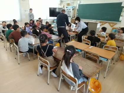 阿倍野区役所の教育支援事業で、ゲストティーチャーに来ていただき、1年生が英語に親しむ活動をしています。