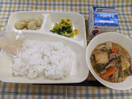 11月1日(金)の給食は「ジャージャンどうふ、チンゲンサイのオイスターソースあえ、まっ茶白玉のきな粉がけ、ごはん、牛乳」です。