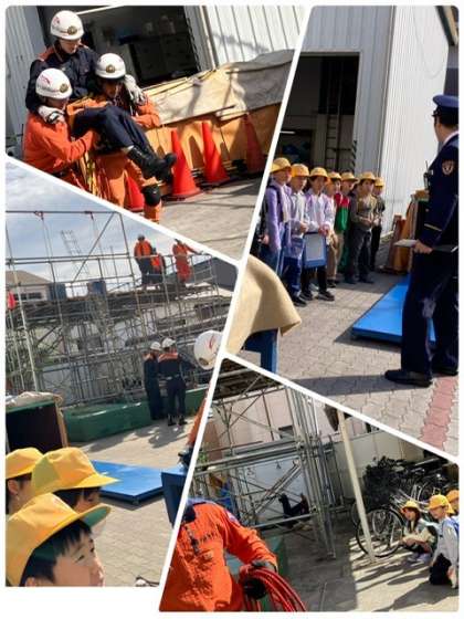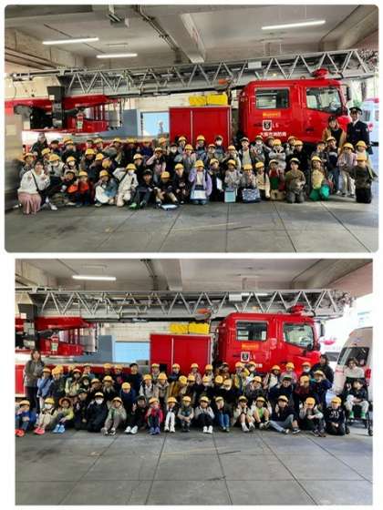 見学では、目の前で迫力のある訓練をされていました。緊張の走る訓練の様子は、みんな驚いていました。またお子様から聞いてください。普段は見られない消防車も近くで見れて、興味津々でした。