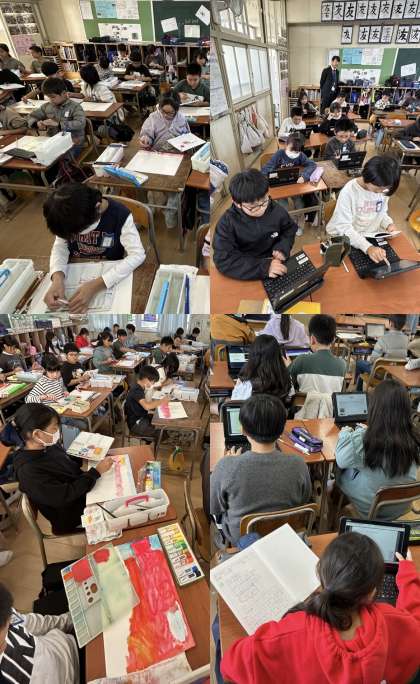 図工では、彫刻刀と並行しながら絵の具で夕焼け空を表現しました。夕焼け空を描いた後は、黒い画用紙で風景や動物の影を切って貼り、完成です!社会では、ICT支援員の方が教室に来てくれたこともあり、大阪府の伝統的な文化財についてタブレットを駆使して発表用ノートにまとめました!