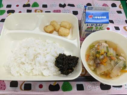 11月11日(月)の給食は「いかてんぷら、五目汁、のりのつくだ煮、ごはん、牛乳」です。
