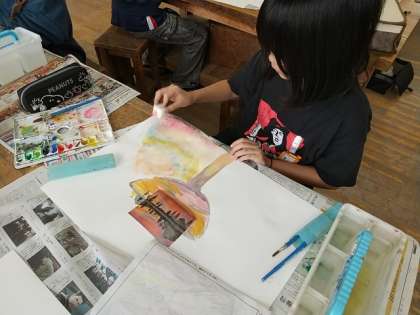 一人一人が選んだ写真から想像して周りの世界を、これまで経験した描画技法で描いていきます。