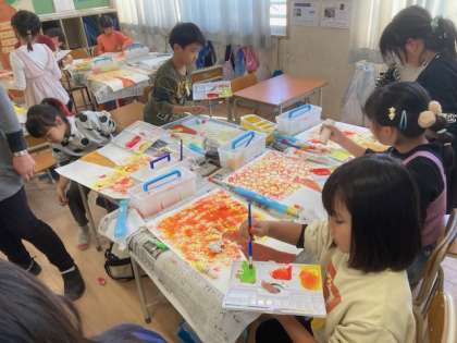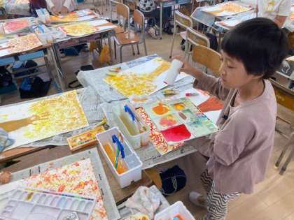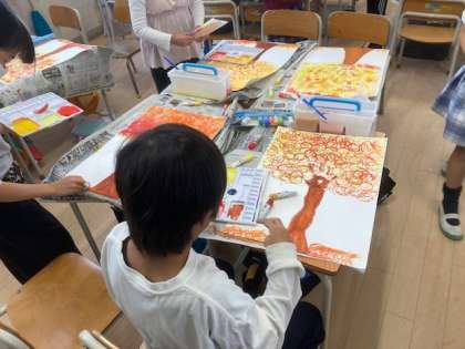 秋の紅葉をイメージしながら絵の具を使い描いています。