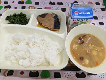 11月14日(木)の給食は「なまりぶしのしょうが煮、なめこのみそ汁、ほうれんそうのごまあえ、ごはん、牛乳」です。