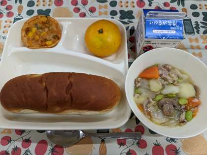 11月15日(金)の給食は「豚肉と野菜のスープ煮、変わりピザ、みかん、おさつパン、牛乳」です。