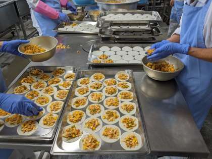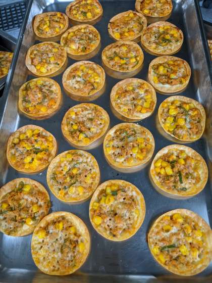 変わりピザは、ギョーザの皮を使った一口サイズのピザです。ツナ、ピーマン、コーン、ピザソース、チーズを混ぜ合わせた具を、ギョーザの皮の上にのせて、オーブンで焼いています。ひとつずつ具をのせるので手間がかかりますが、毎回好評なこんだてです。トースターやフライパンでも焼けるので、ギョーザの皮が余ったら、いろいろな具をのせて作ってみてください。