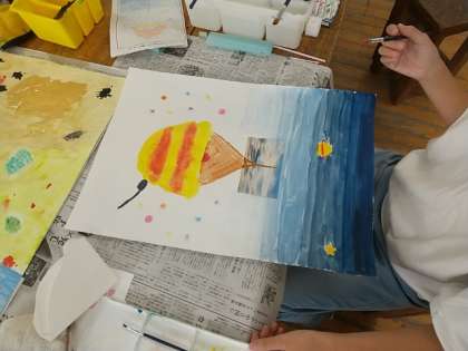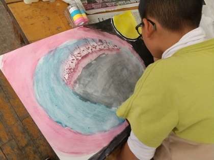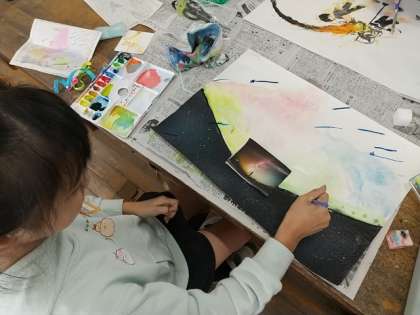 選んだ写真から発想を広げ、思い思いの表現方法で楽しみながら未知の世界を描いています。