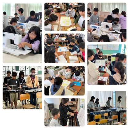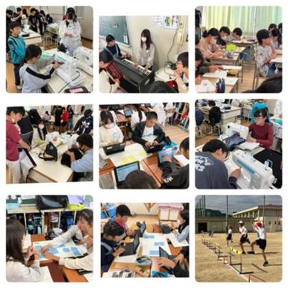 家庭科ではミシンを使って、エプロン作りをしています。5年生のときに使ったことを思い出しながら、上手に縫うことができていました。下糸や上糸をミシンに通すのが難しく、班で協力しながら作業を進めていました。