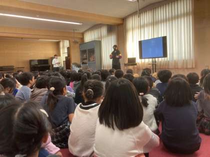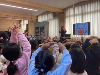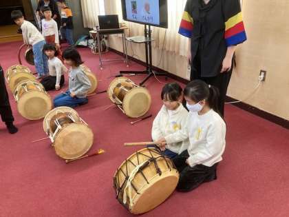 挨拶や食べ物のクイズ、楽器など実際に見て話しながら学びました。