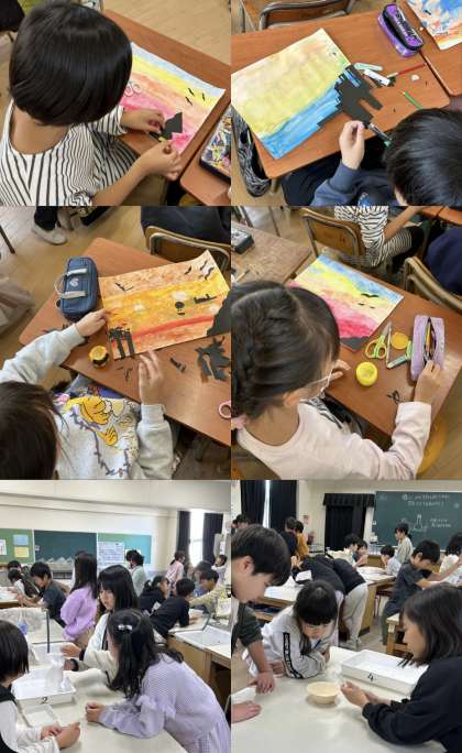 図工では、夕焼け空にうつる影を黒色の画用紙で表現しました。理科では、温められた空気の体積はどのように変化するのかを実験や動画を通して学習しました。
