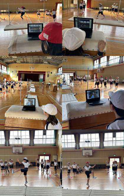 体育では、走り高跳びをし、10秒後に再生されるタブレットの「追いかけ再生」を利用して、自分が跳んだ様子を確認して、きれいなフォームで跳ぶことを意識しながら練習を重ねました。
