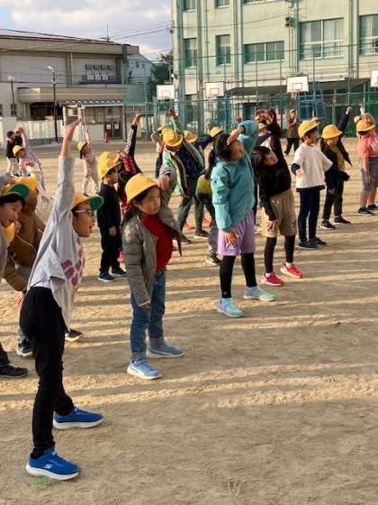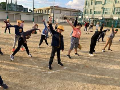 運動場に大きな声が響きます。体の伸びを感じながら、体操することができていました。
