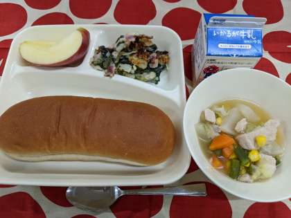 11月22日(金)の給食は「ほうれんそうのグラタン、スープ煮、りんご、黒糖パン、牛乳」です。