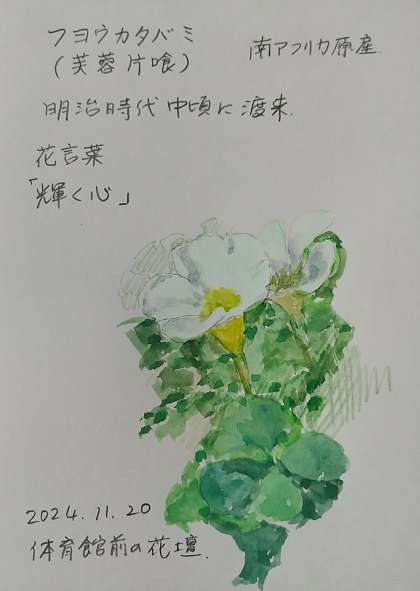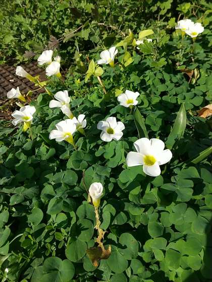フヨウカタバミは、ピンク色のものもあるが、白花は冬の日差しを受けて真っ白に輝く。たくさんの種類があるカタバミの中でも、ひときわ存在感がある。