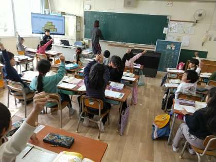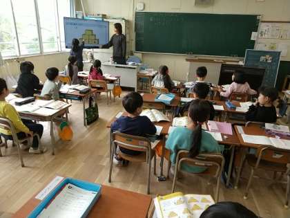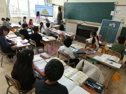 1年生が算数の足し算の応用問題で、「計算ピラミッド」に取り組んでいました。