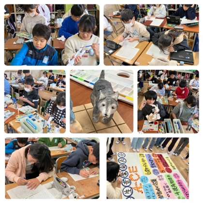 図画工作科「未来のわたし」では、形をつくりあげたものに絵の具で色をつけていきました。粘土のぼこぼこしたところにも色をつけようと、細かいところも丁寧に塗って作品を仕上げていました。