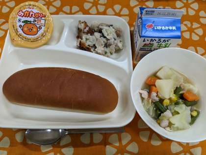 12月3日(火)の給食は「きのこのドリア、鶏肉と野菜のスープ煮、みかんゼリー、黒糖パン、牛乳」です。