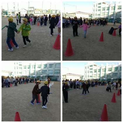 ペアが手をつないで、2年生はバトンを掌の上にねかせ、5年生はバトンを掌の上に立ててコーンまで往復します。