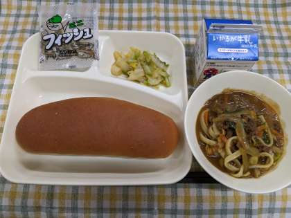 12月13日(金)の給食は「カレーうどん、はくさいのおひたし、ミニフィッシュ、黒糖パン、牛乳」です。