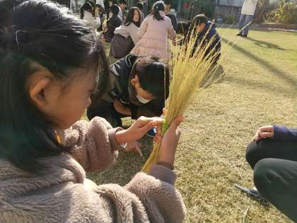 自然学習園の田んぼで田植えから初めて稲刈りでの収穫、脱穀などを経験し、残ったわらもミニほうきにして、生活で活用できるものを作りました。