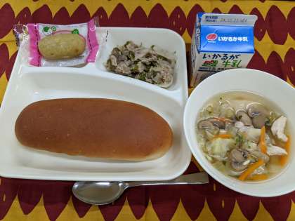 12月17日(火)の給食は「豚肉と野菜のソテー、スープ、スイートポテト、黒糖パン、牛乳」です。