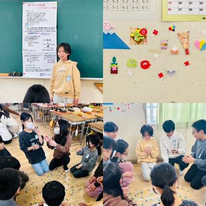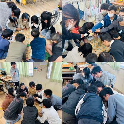 始業式の後、書初めを提出したり、自由研究の発表を聞いたりしました。