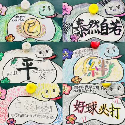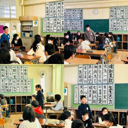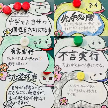 書初めと同じ四字熟語に詳しい説明を付け加えたり、書初めとは違うもう一つの目標を掲げたり、工夫をこらして目標カードに取り組んでいました。