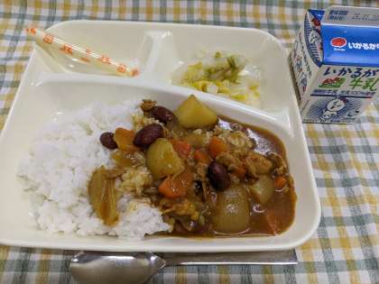1月14日(火)の給食は「豚肉と金時豆のカレーライス、はくさいのピクルス、棒チーズ、牛乳」です。
