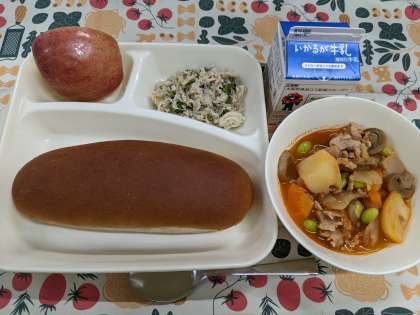 1月15日(水)の給食は「ケチャップ煮、ささみと野菜のソテー、りんご、黒糖パン、牛乳」です。