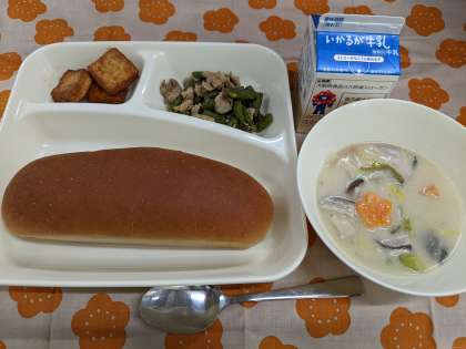 1月22日(水)の給食は「はくさいのクリーム煮、あつあげのピリ辛じょうゆかけ、豚肉とさんどまめのオイスターソースいため、黒糖パン、牛乳」です。