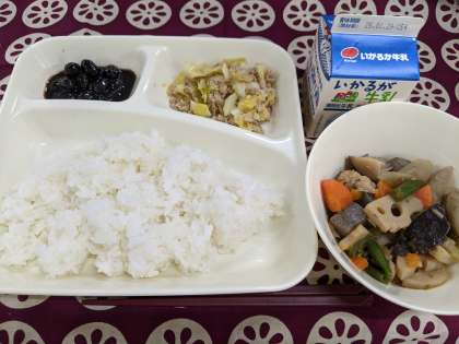 1月23日(木)の給食は「筑前煮、ツナとキャベツのごまいため、黒豆の煮もの、ごはん、牛乳」です。