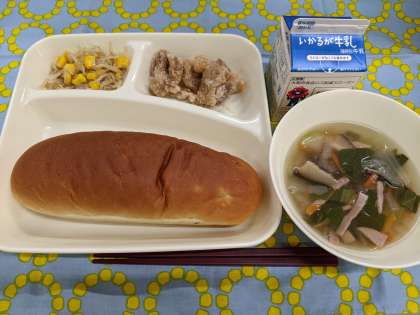 1月24日(金)の給食は「鶏肉のからあげ、ハムと野菜の中華スープ、もやしとコーンの中華あえ、おさつパン、牛乳」です。