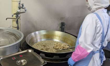 鶏肉のからあげは、いつも大人気のこんだてです。しょうが、にんにく、塩、こしょうで下味をつけた鶏肉に、でんぷんをまぶして揚げています。