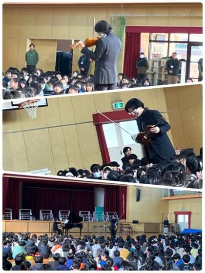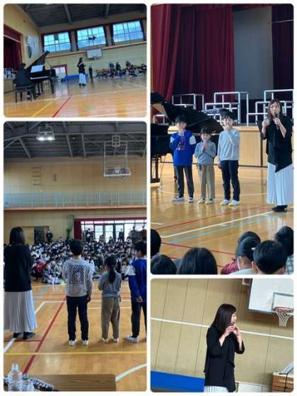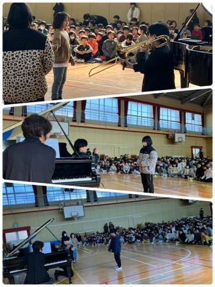 講堂で児童全員が集合し、ヴァイオリン・フルート・トロンボーンの演奏や楽器の説明をききました。今日はピアノと合わせて、4名の演奏者が来られましたが、次回の本番は64名の演奏者が来られます。29日水曜日、楽しみですね。