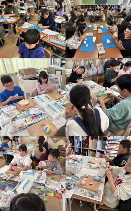 また、図画工作では「元気が出るおまもり」をテーマに紙粘土で各々が元気が出そうな形を表現しました。