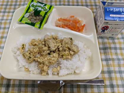 1月27日(月)の給食は「親子丼〈卵除去食〉、紅白なます、まっ茶大豆、牛乳」です。
