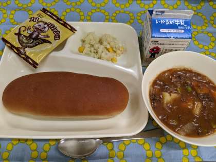 1月29日(水)の給食は「ビーフシチュー、カリフラワーとコーンのサラダ、カレーフィッシュ、黒糖パン、牛乳」です。
